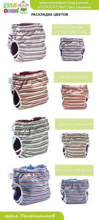 - Ето красиво, современно: разные цвета сделают малыша индивидуальнееМногоразовые подгузники — это отличный способ экономии средств. Несложно посчитать насколько дорого обходятся подгузники разового пользования, кроме того, их утилизация наносит существенный вред экологии. Подгузники неоднократного использования обладают прекрасной впитываемостью, водонепроницаемостью, при этом поверхность их дышащая. Определиться с выбором какая модель удобнее в использовании, подойдет вашему ребенку? Рекомендуем приобрести Эконом набор Ассорти №2 и сравнить два вида подгузников — с карманом, без него.