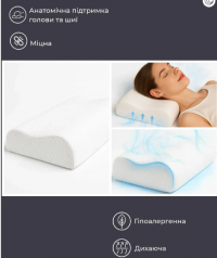 Ергономічна подушка розроблена в формі хвилі, що забезпечує анатомічно правильне положення та підтримку шиї під час відпочинку в будь-якому положенні. Подушка виготовляється у двох розмірах: 49х32х10.5 см та 58х40х10.5 см. Чохол виготовлений з подвійної трикотажної тканини Double Jersey, що м’яка та приємна на дотик (100% PES). Швидко сохне після прання.